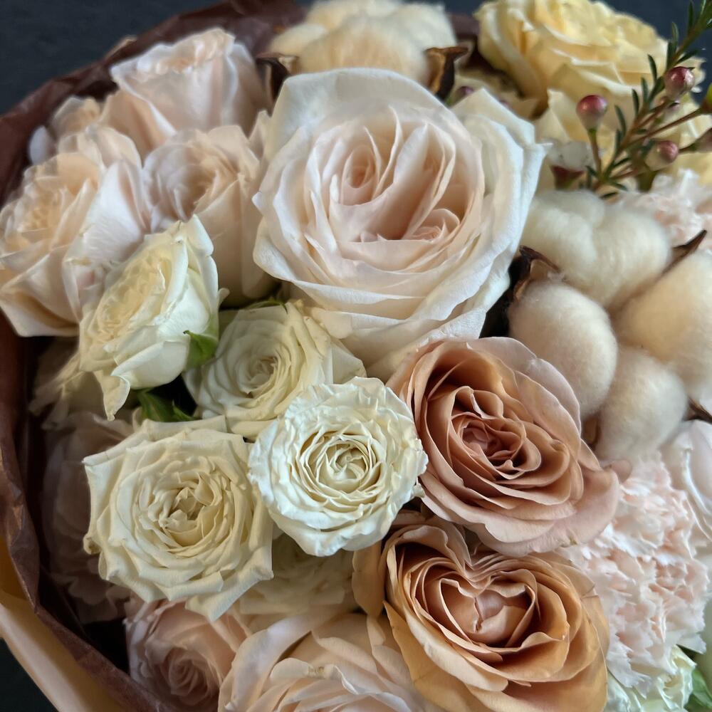 Букет из ароматных пионовидных роз и хлопка «Капуччино»