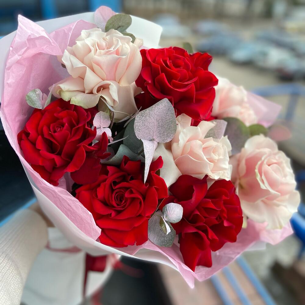 Французская роза – 9 шт. Эвкалипт – 1 шт. Упаковка дизайнерская – 1 шт.
