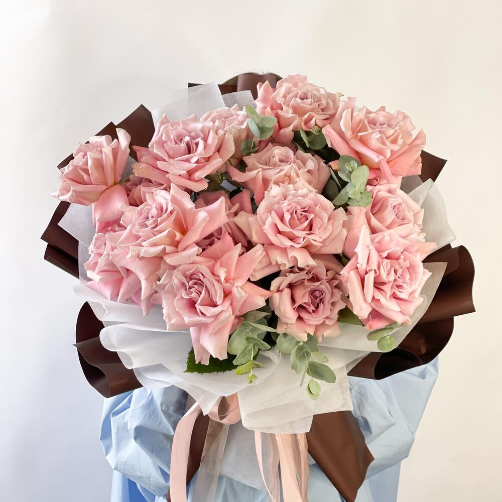 Лента – 3 шт.Эвкалипт – 3 шт.Роза – 15 шт.Упаковка дизайнерская – 4 шт.