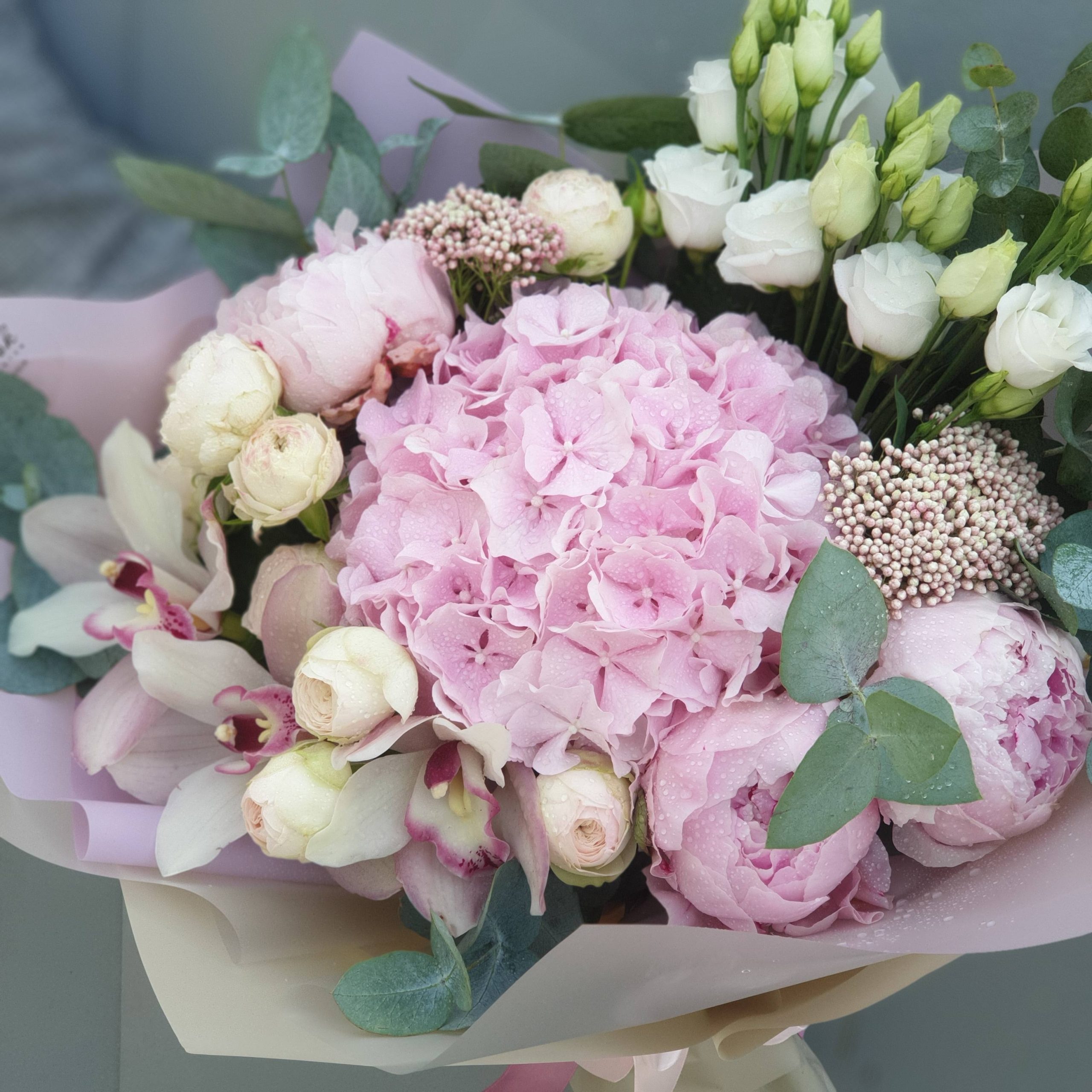 Букет из 3 белых и розовых гортензий в стильной упаковке "Свияш"
