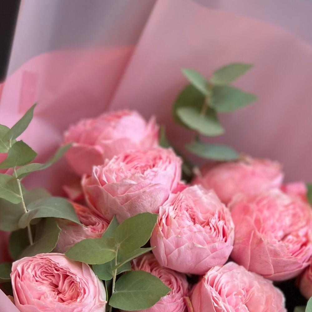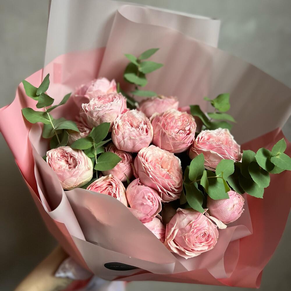 Букет из кустовой пионовидной розы и эвкалипт