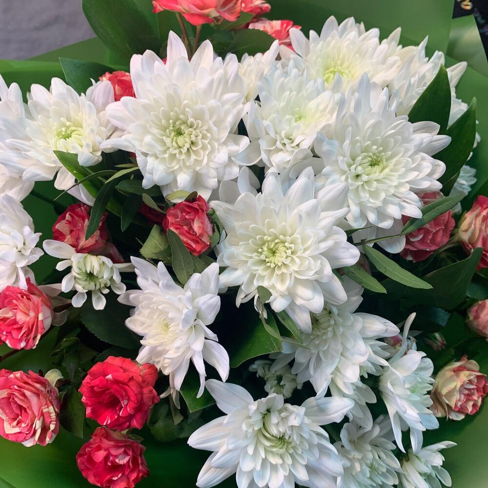 Рускус – 5 шт.Хризантема кустовая – 4 шт.Кустовая роза – 5 шт.Фисташка – 2 шт.Упаковка дизайнерская – 1 шт.
