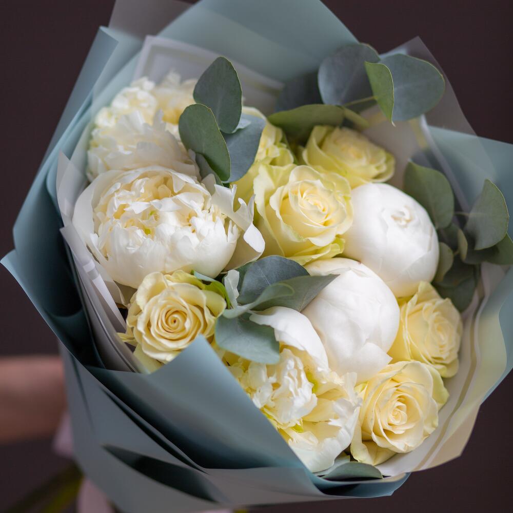пион duchesse de nemours – 5 шт.Роза 70 см – 6 шт.Эвкалипт – 2 шт.Упаковка матовая – 2 шт.Лента атласная – 1 шт.