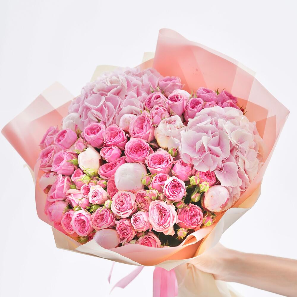 Пионовидная роза кустовая – 11 шт.пионы – 9 шт.гортензия розовая большая – 9 шт.Лента атласная – 2 шт.Упаковка дизайнерская – 2 шт.Кризал – 1 шт.инструкция по уходу за цветами – 1 шт.коробка переноска – 1 шт.