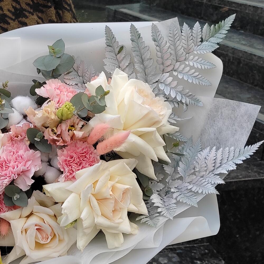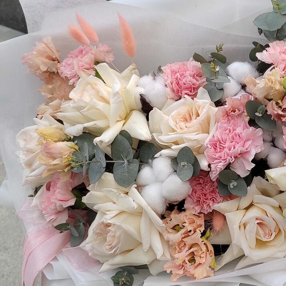 Категорий: Гвоздики, Лизиантусы, Пионовидные розы, Розы, Сухоцвет