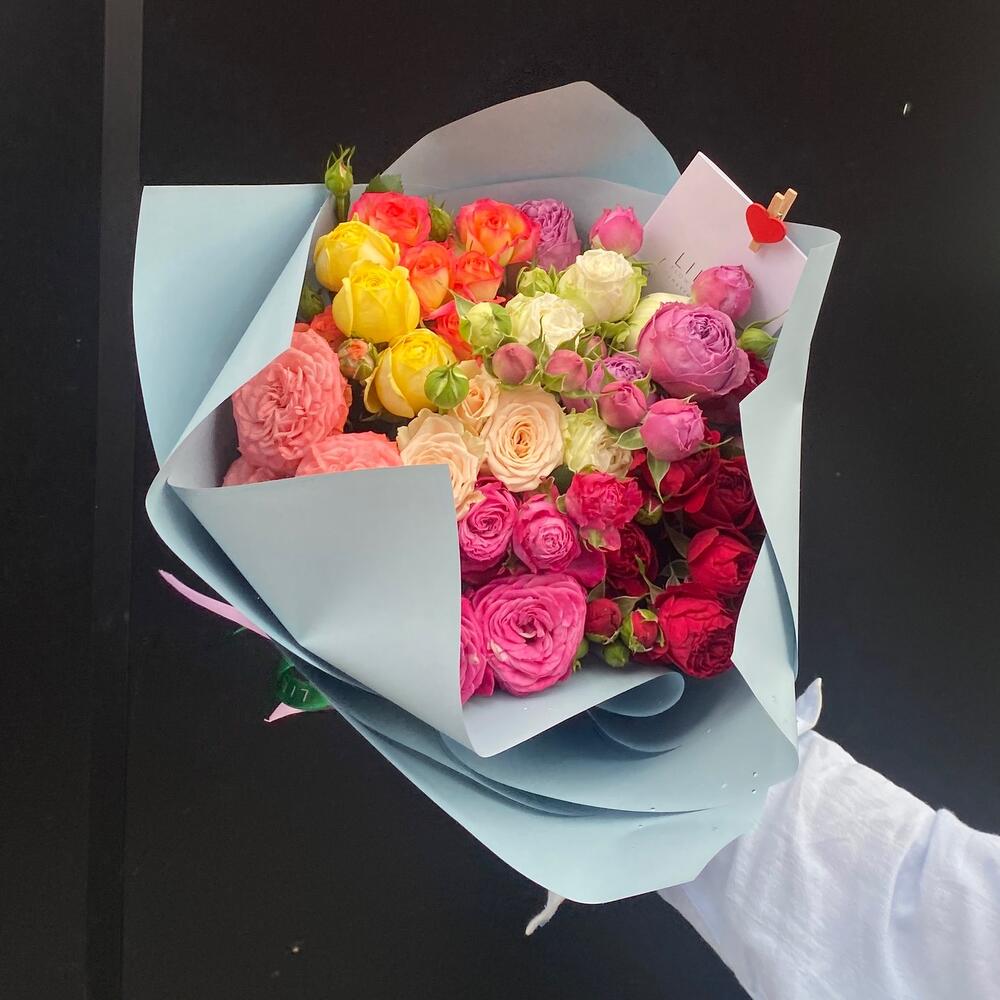 Упаковка дизайнерская – 3 шт. Пионовидная кустовая роза – 9 шт. Открыточка с вашими пожеланиями – 1 шт. инструкция по уходу за цветами – 1 шт.