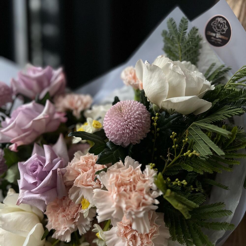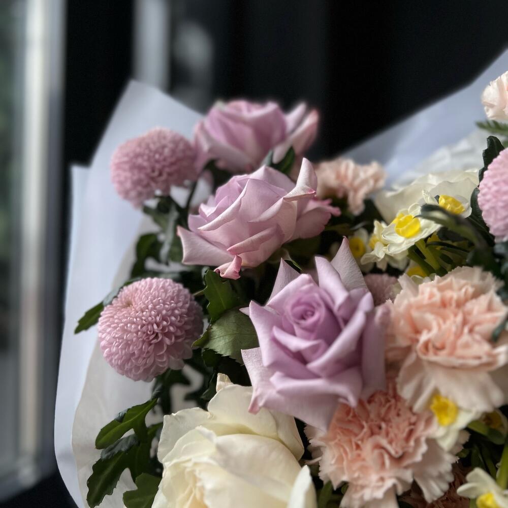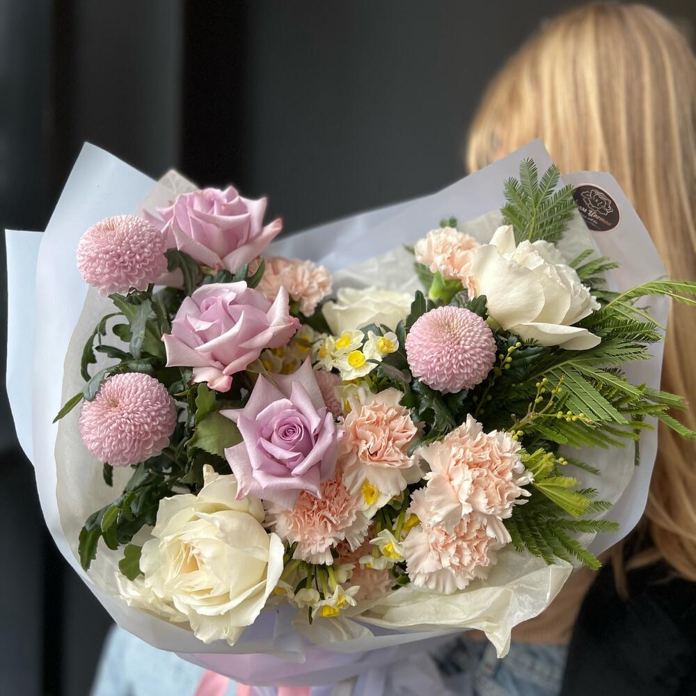 Категории: Гвоздики, Пионовидные розы, Розы, Хризантемы