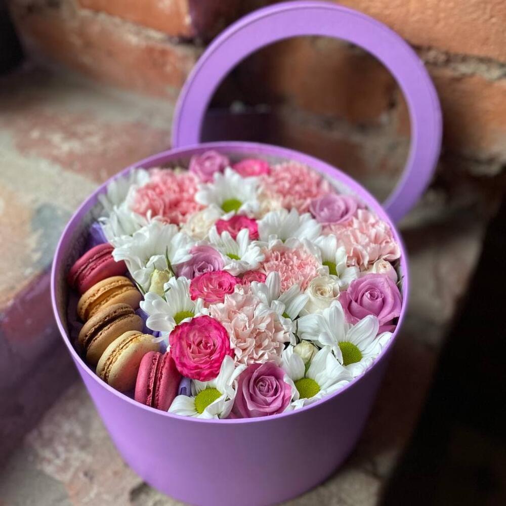 Букет из роз, хризантем, диантуса и макаронс в декоративной коробке “Сладкая встреча”