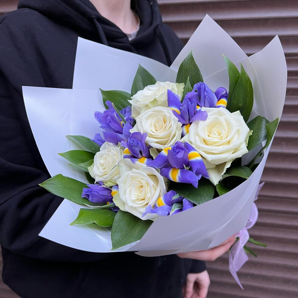 Ирис – 8 шт.Зелень – 8 шт.Роза белая – 5 шт.корея пленка – 1 шт.