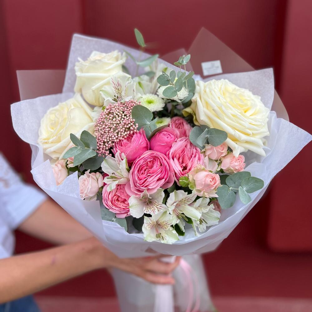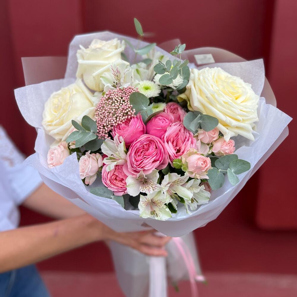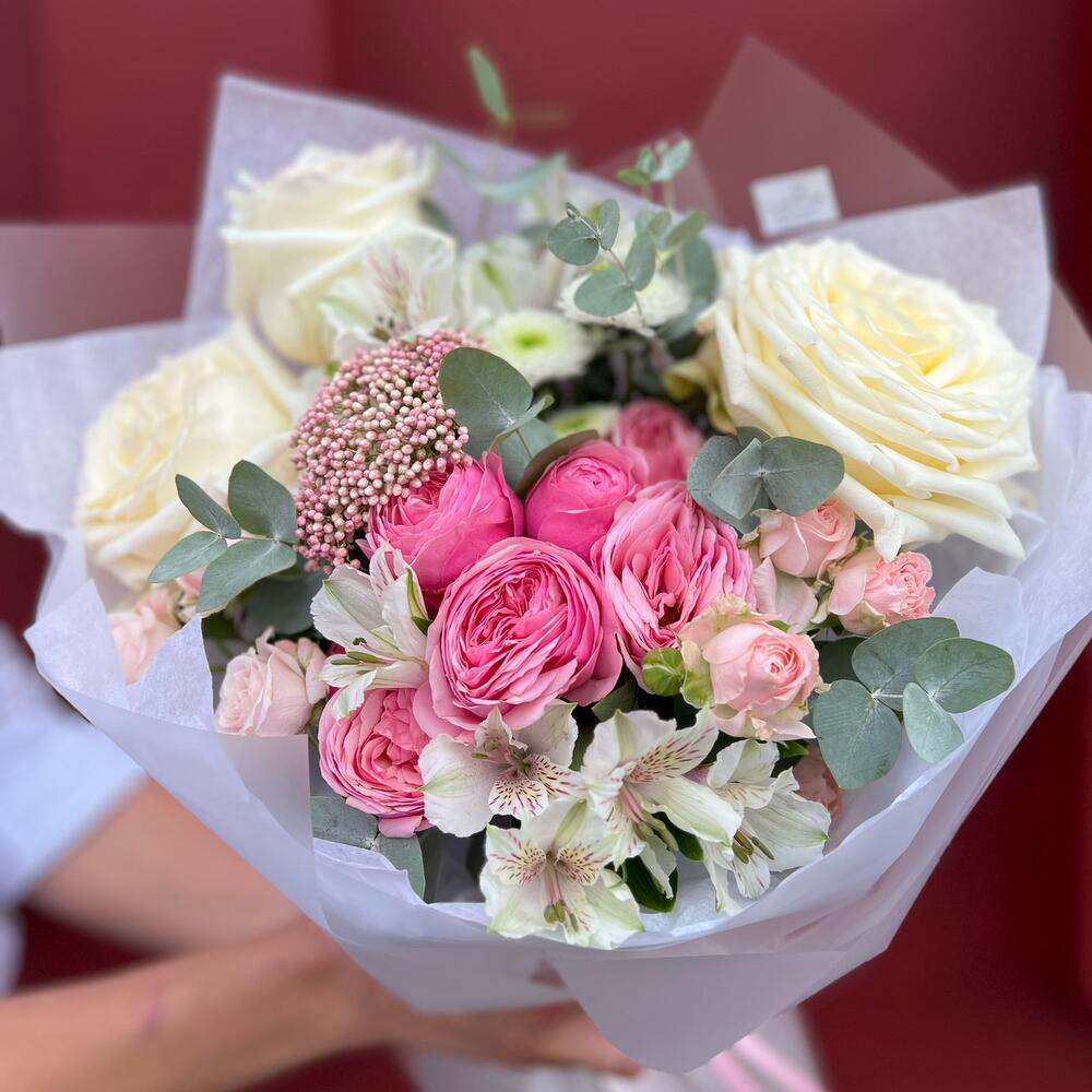 Гвоздики, Лизиантусы, Розы, Тюльпаны