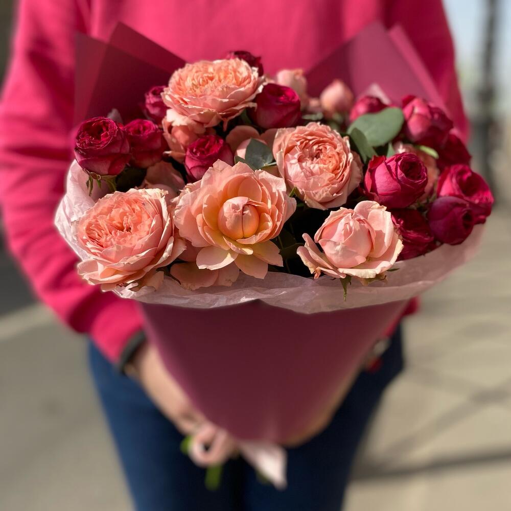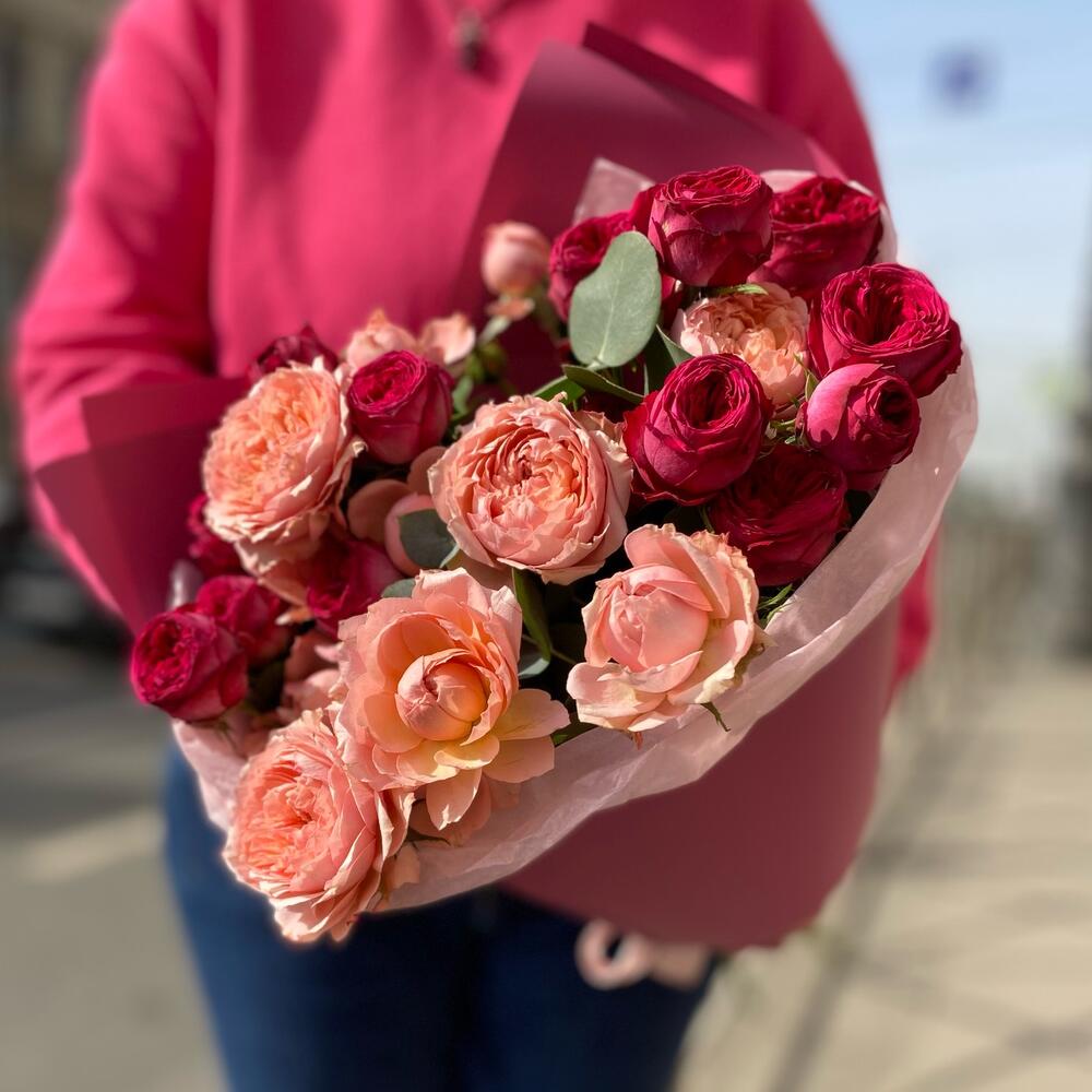 Эвкалипт – 3 шт.Роза кустовая пионовидная – 5 шт.Упаковка дизайнерская – 1 шт.