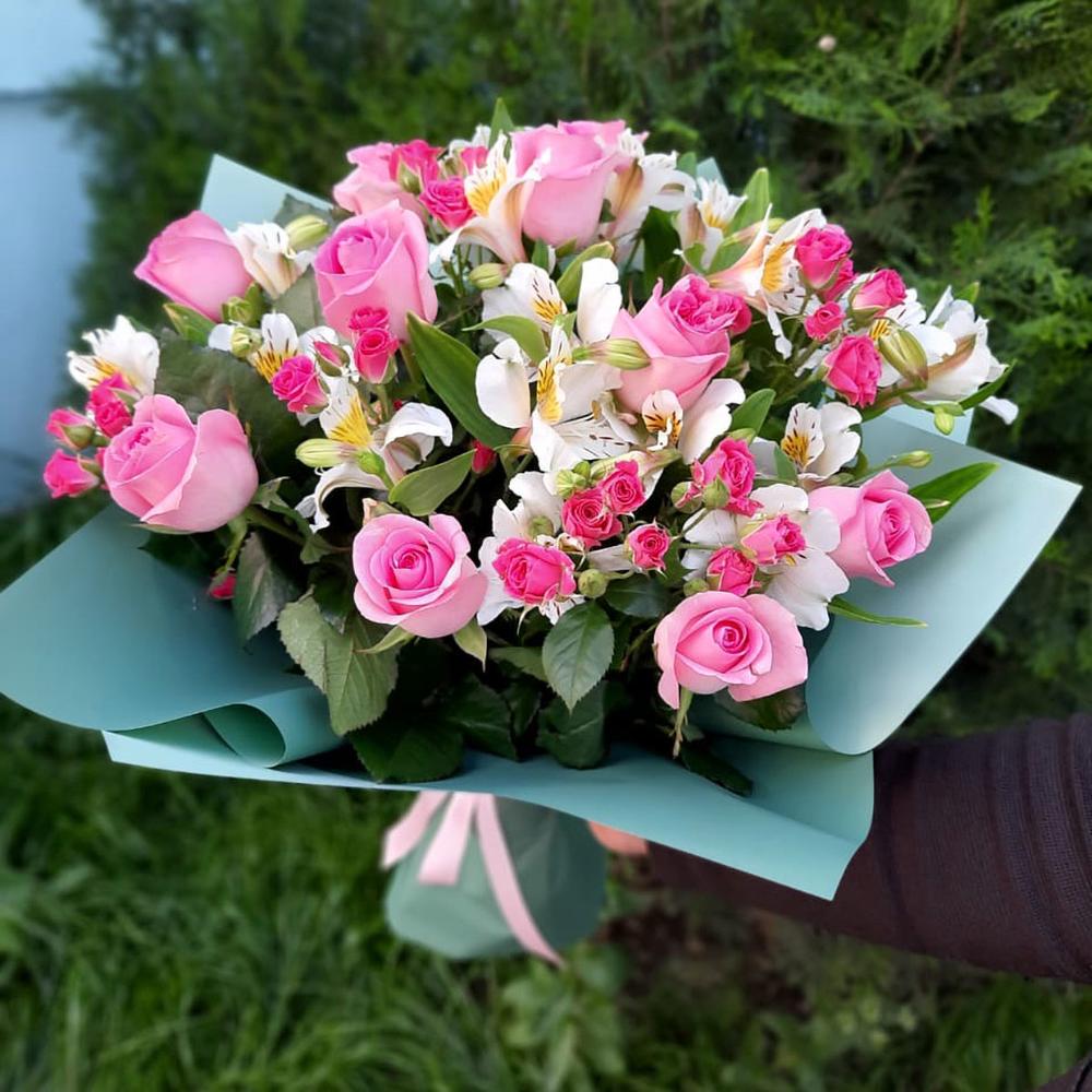 Чудесный букет из розовых роз, белых альстромерий и розовых кустовых роз в стильном оформлении.