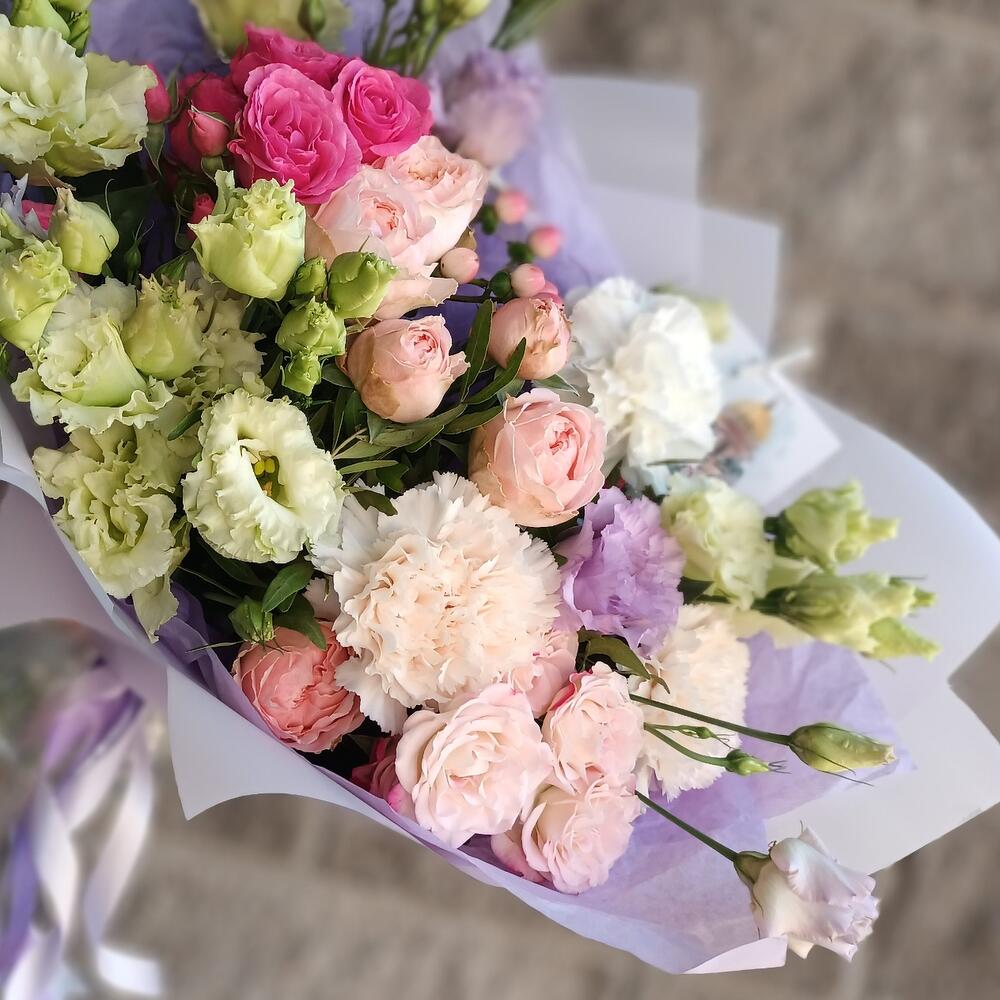 Букет с эустомой,пионовидными розами и гвоздикой