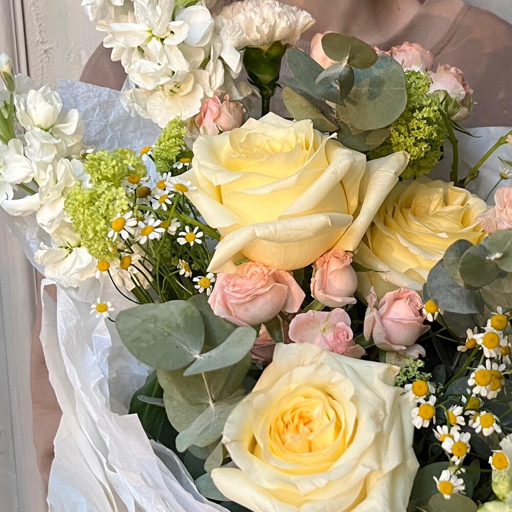 Букет с маттиолой, пионовидной розой, кустовой розой и матрикарией