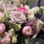 Букет с пионовидной кустовой розой, ваксфлаувером и маттиолой