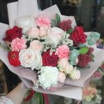 Роза кустовая пионовидная – 2 шт.Роза пионовидная – 3 шт.Роза – 3 шт.Эвкалипт пучок – 1 шт.диантос – 4 шт.Лимониум – 2 шт.Скиммия пучок – 1 шт.Ранункулюс – 1 шт.Упаковка дизайнерская – 2 шт.
