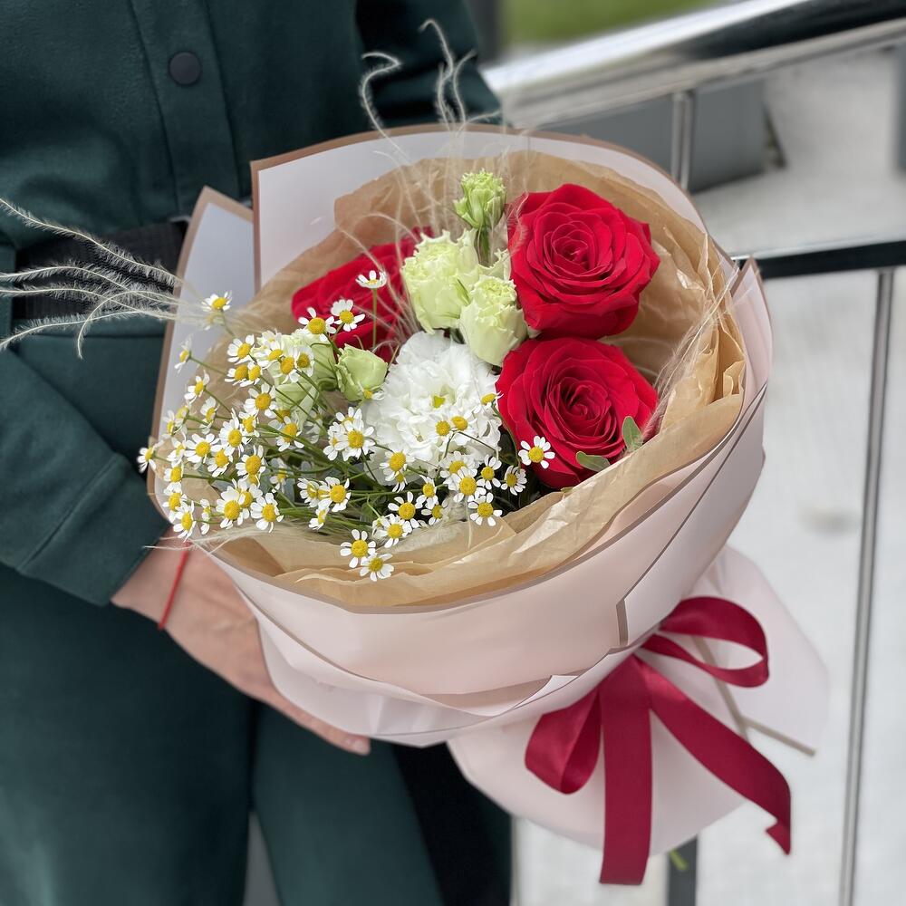 Букет Жаннет из роз, стифы, ромашек и эустомы