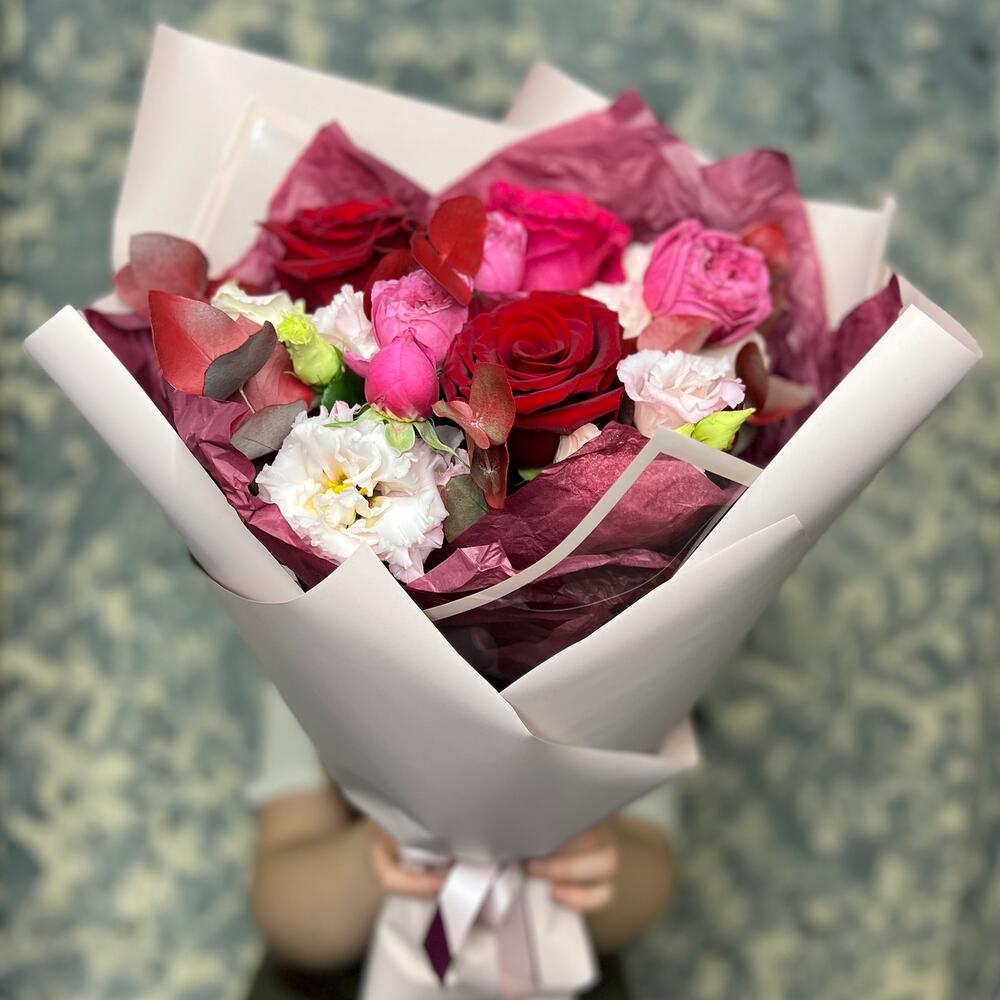 Роза Pink Floyd – 1 шт.Роза Эксплорер – 2 шт.роза кустовая пионовидная джульетта церайз – 1 шт.роза кустовая пионовидная мэнсфилд парк – 1 шт.эустома розовая – 1 шт.Эвкалипт – 1 шт.Тишью – 2 шт.Пленка матовая – 5 шт.Лента атласная – 2 шт.
