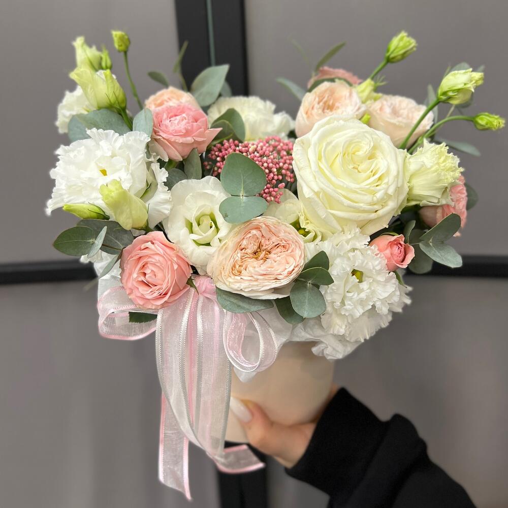 Озотамнус – 1 шт.Эвкалипт – 2 шт.Лента атласная – 2 шт.Диантус – 1 шт.Коробка шляпная – 1 шт.Оазис флористический – 1 шт.эустома махровая белая – 1 шт.роза кустовая мадам бомбастик – 1 шт.эустома розита вайт – 1 шт.роза кустовая пионовидная мэнсфилд парк – 1 шт.роза пионовидная плайя бланка – 1 шт.