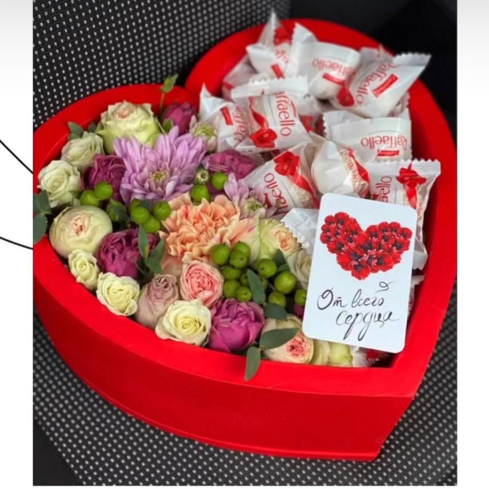 Коробка сердце – 1 шт.Флористическая губка – 1 шт.Роза одноголовая – 3 шт.Роза кустовая – 5 шт.Эвкалипт – 1 шт.Карточка для подписи – 1 шт.рафаело конфеты – 15 шт.