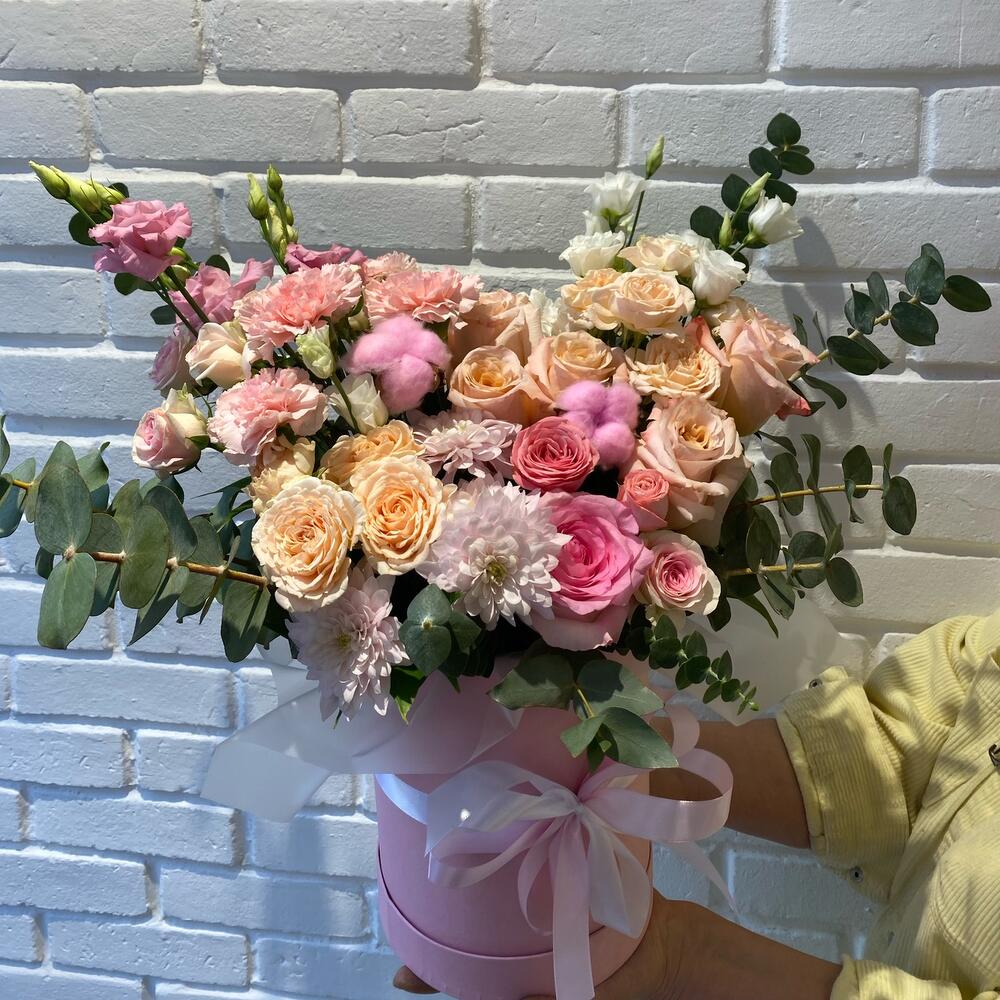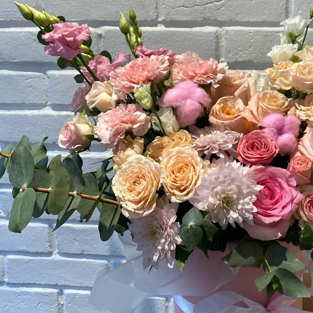 Альстромерии, Кустовые розы, Лизиантусы, Пионовидные розы, Розы, Ромашки