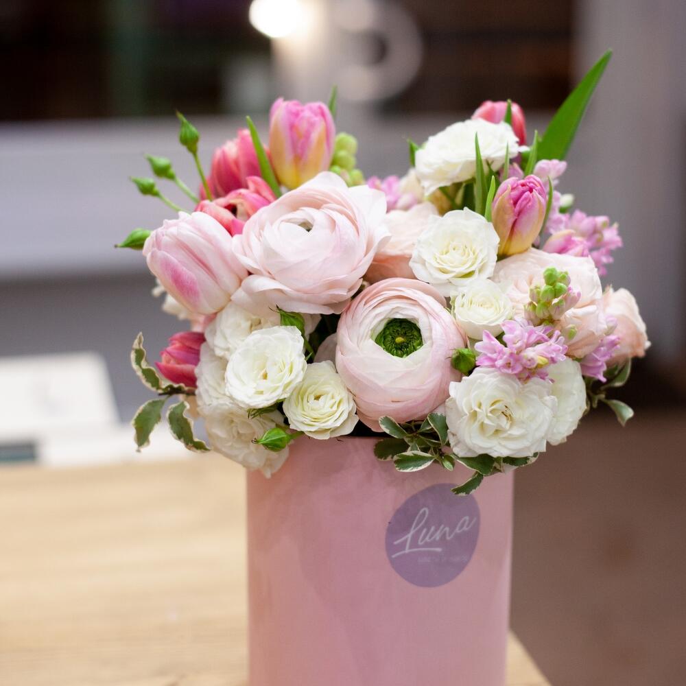Нежная композиция с розовыми лютиками в шляпной коробке ❤️