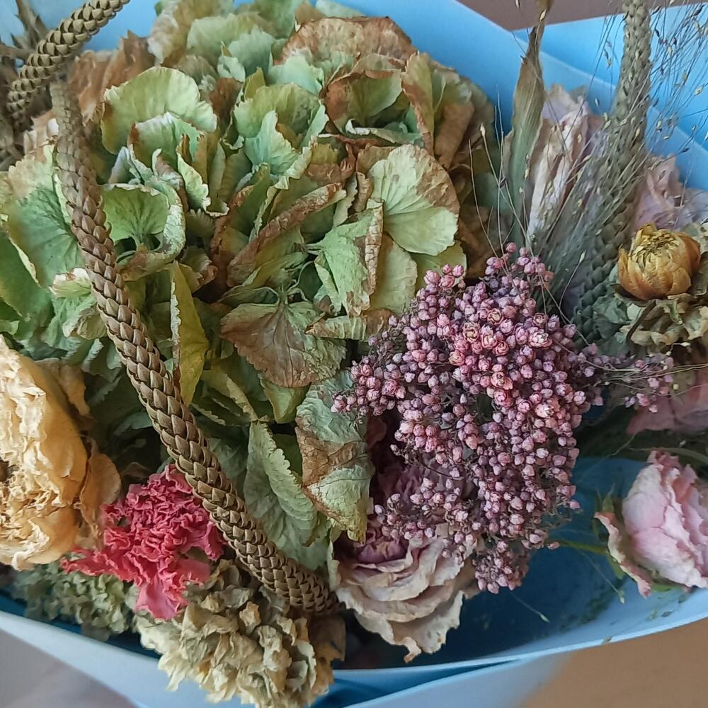 Гортензия – 1 шт.Эрингиум зеленый – 1 шт.Роза кустовая – 2 шт.Роза – 3 шт.Оксипеталум – 1 шт.Гвоздика – 3 шт.