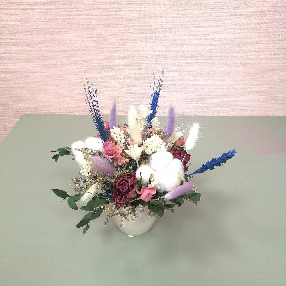 Лагурус – 8 шт.Колосья – 3 шт.озотамнус стабилизированный – 2 шт.Хлопок натуральный – 2 шт.Эвкалипт – 1 шт.Роза кустовая сухоцвет – 1 шт.гипсофила радужная – 1 шт.зелень декоративная – 6 шт.Оазис флористический – 1 шт.Кашпо керамическое – 1 шт.