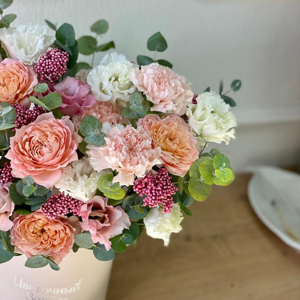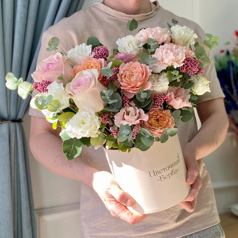 Кустовая роза – 2 шт.Гвоздика – 3 шт.Коробка шляпная – 1 шт.Роза розовая – 2 шт.эустома розовая – 1 шт.эустома белая – 2 шт.озотамнус стабилизированный – 9 шт.эвкалипт композиционный – 30 шт.