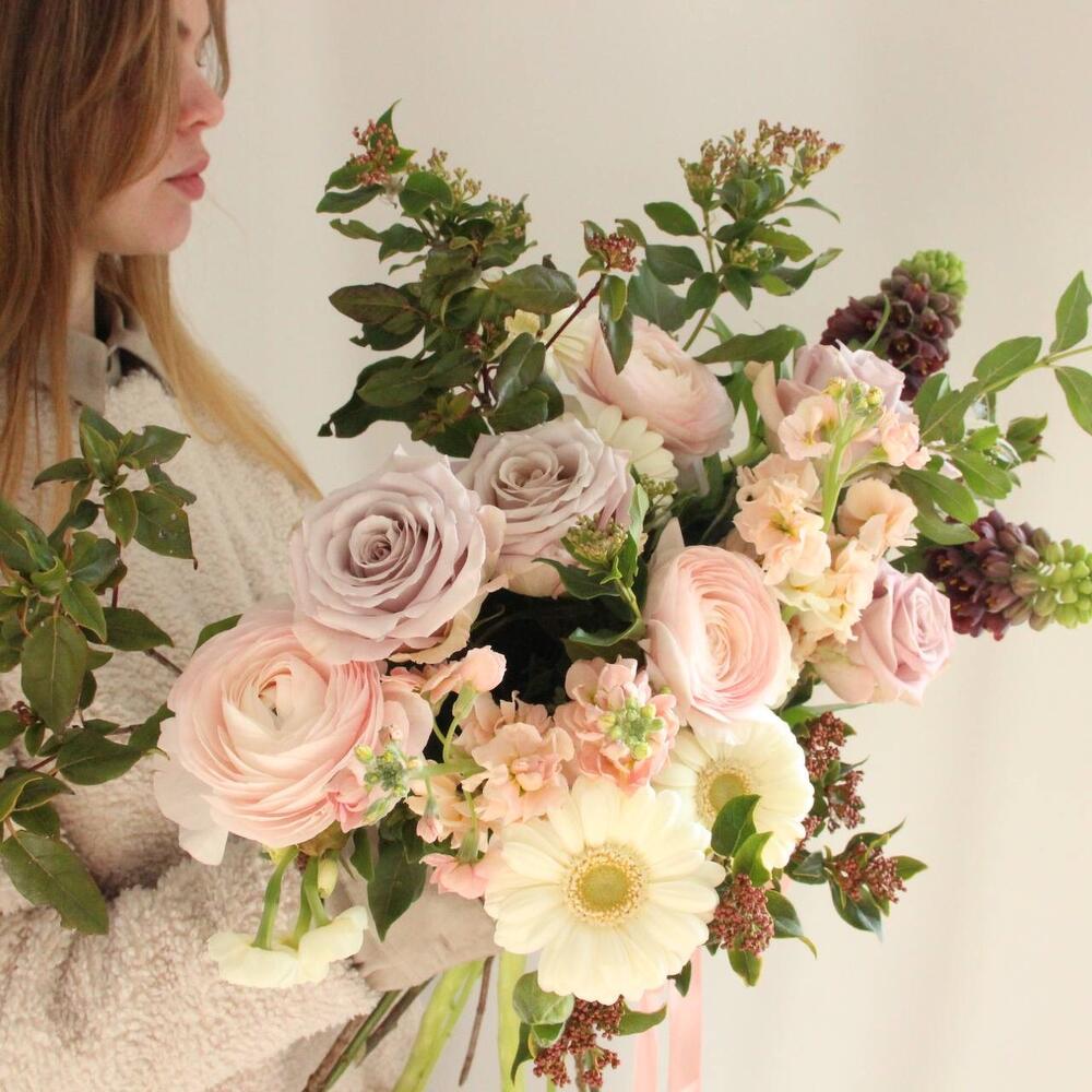 Ранункулюс – 3 шт.Роза сортовая – 5 шт.Гербера – 4 шт.Нарцисс кустовой – 3 шт.Маттиола – 3 шт.вибурнум цветущий – 5 шт.Лента атласная – 1 шт.