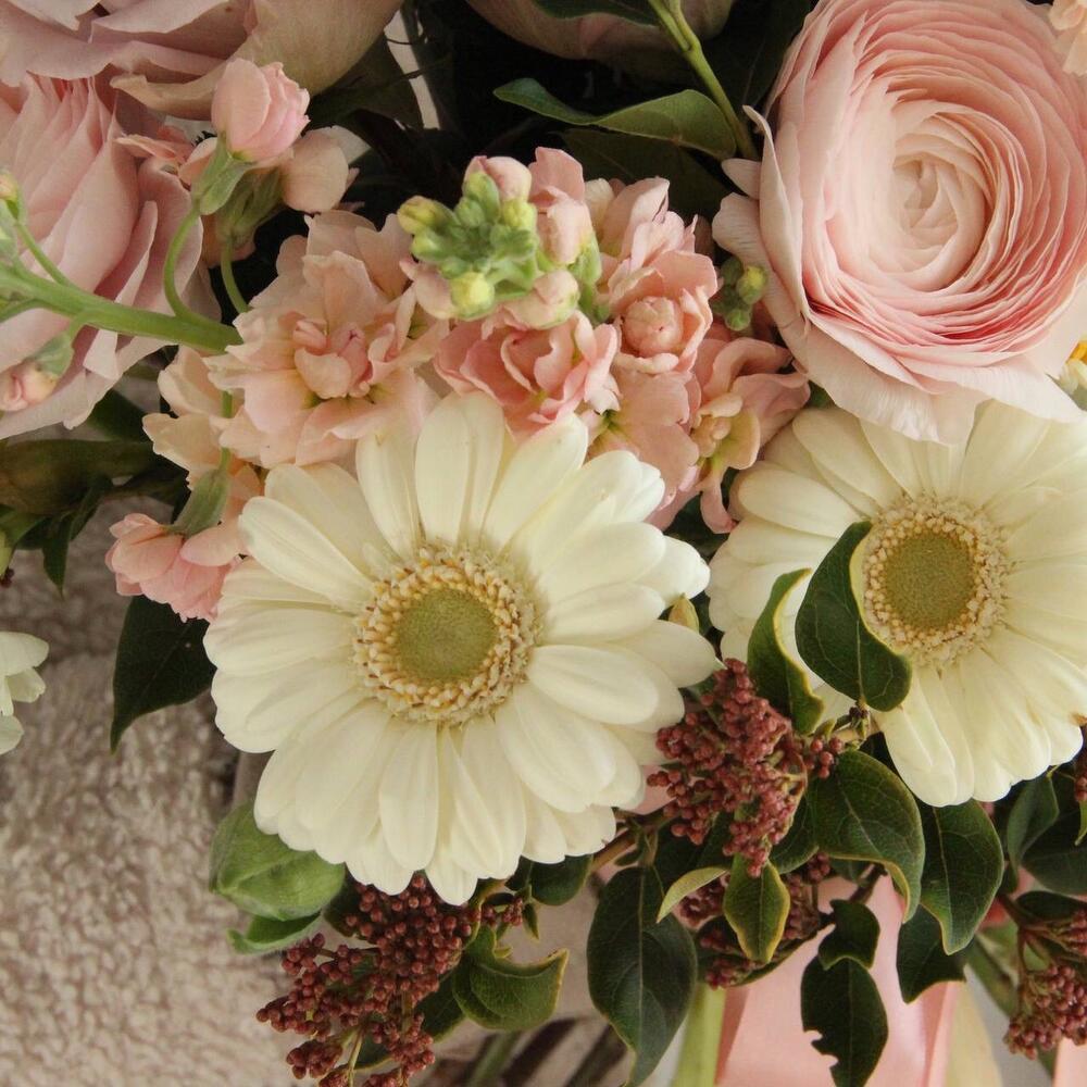 Круглый розовый букет с ранункулусами