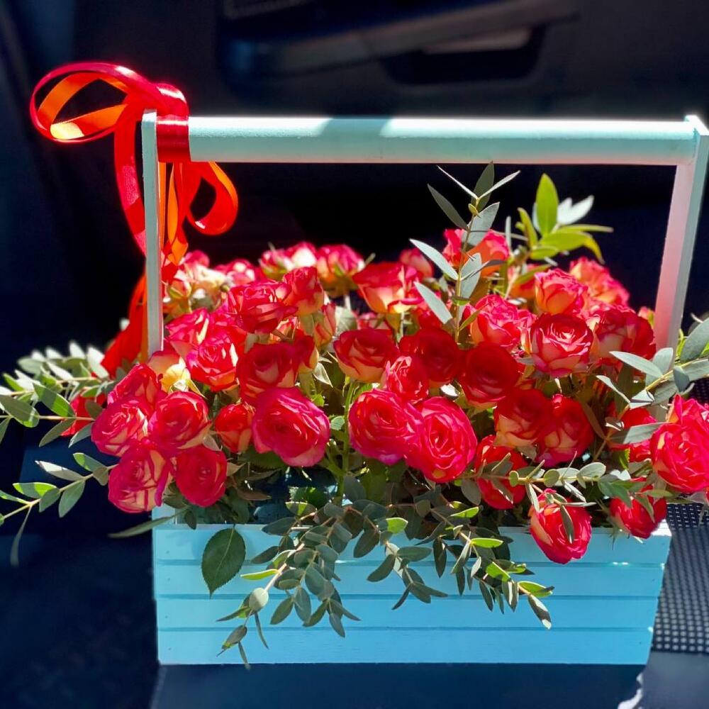 Роза кустовая – 15 шт.Эвкалипт – 4 шт.Лента атласная – 2 шт.Ящик деревянный – 1 шт.Оазис флористический – 1 шт.
