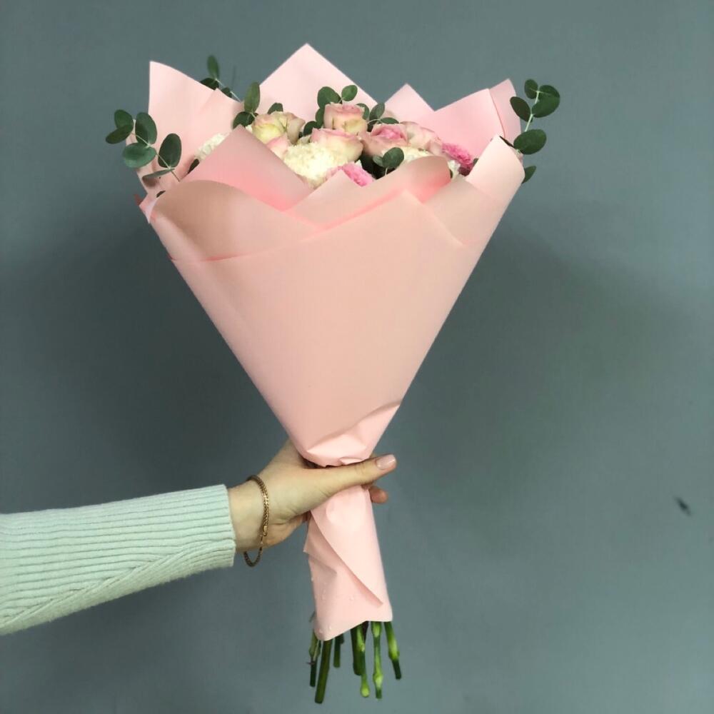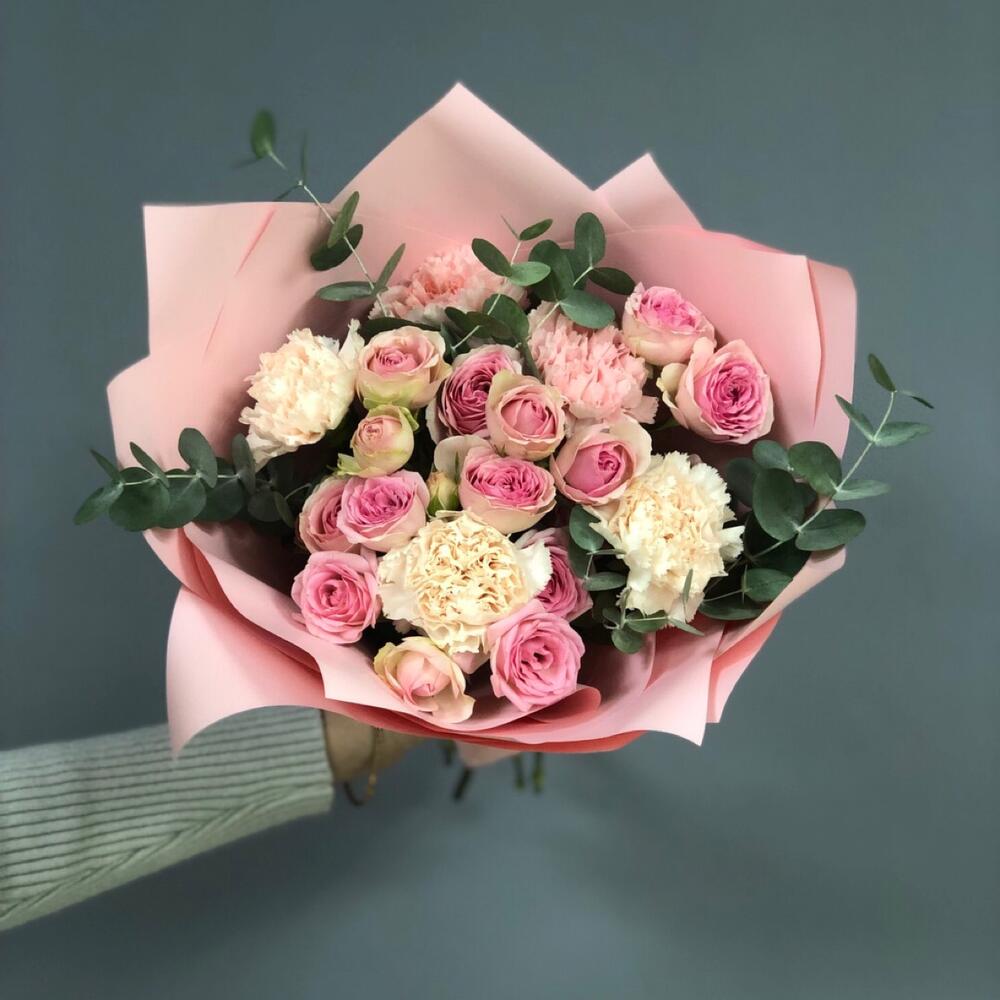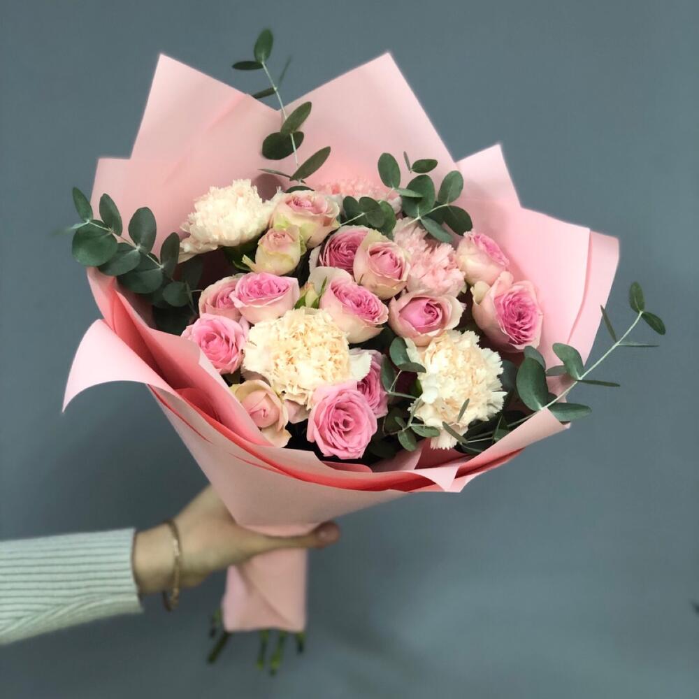Диантус – 5 шт.Кустовая роза – 5 шт.Эвкалипт – 2 шт.Матовая пленка – 1 шт.Атласная лента – 1 шт.