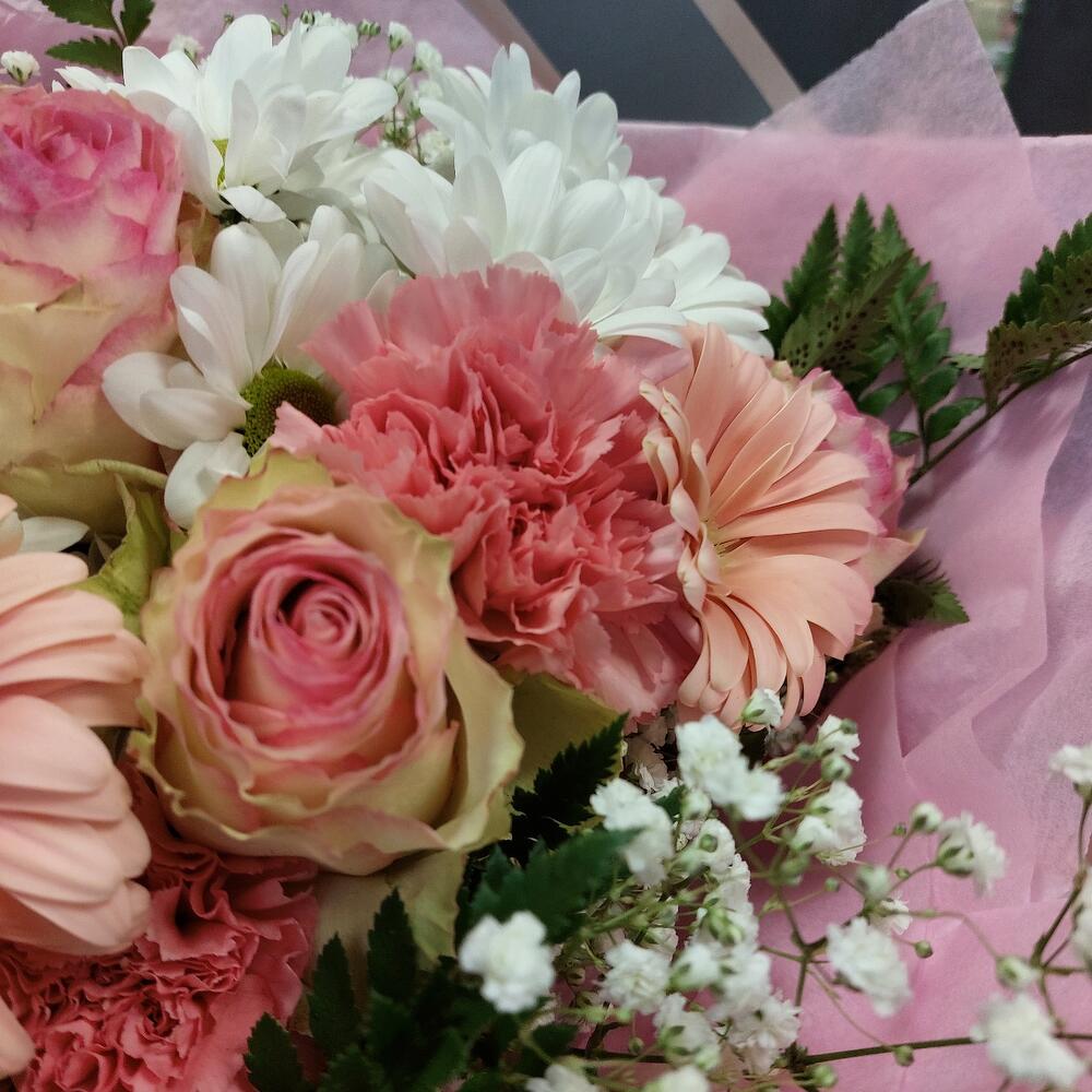 Роза эквадор 50 см – 5 шт.Гербера – 5 шт.Гвоздика – 5 шт.Гипсофила – 2 шт.Листья папоротника – 3 шт.Хризантема кустовая – 2 шт.Упаковка дизайнерская – 4 шт.Лента атласная – 2 шт.