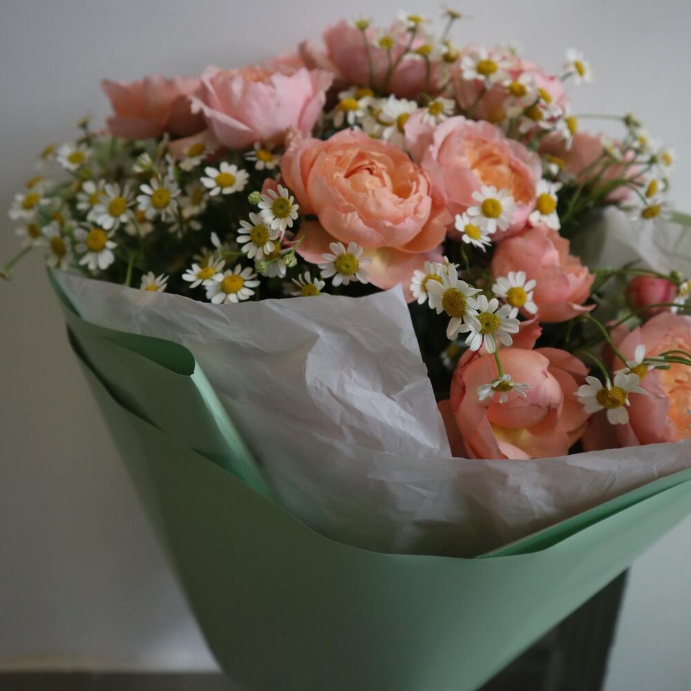 роза кустовая джульетта пионовидная – 3 шт.Матрикария (Ромашка Камила) – 5 шт.тишью водостойкое – 5 шт.пленка глянцевая – 4 шт.Рафия – 1 шт.