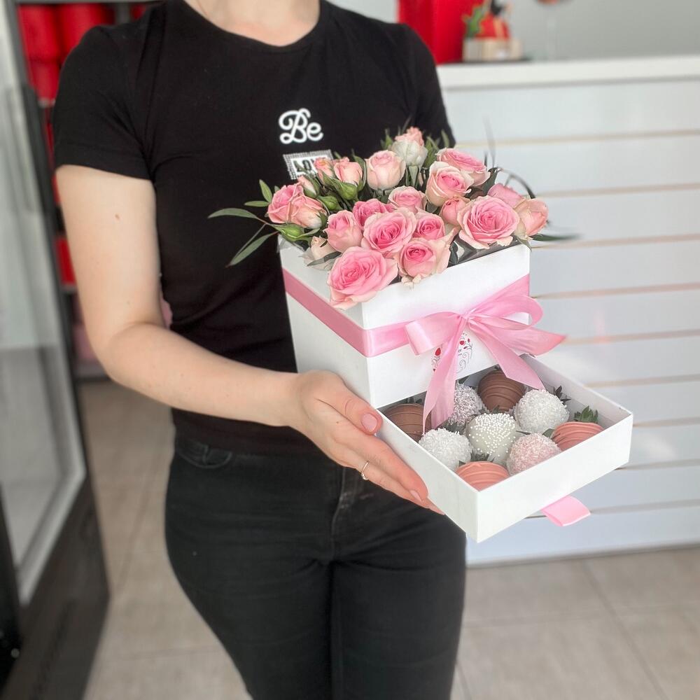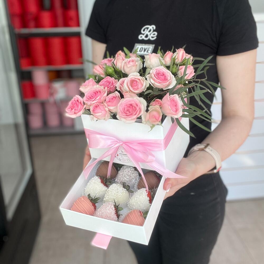 Зелень – 5 шт.Лента атласная – 1 шт.Коробка шляпная – 1 шт.Флористическая губка – 1 шт.Клубника в шоколаде callebaut (бельгия) – 9 шт.роза кустовая динара – 5 шт.