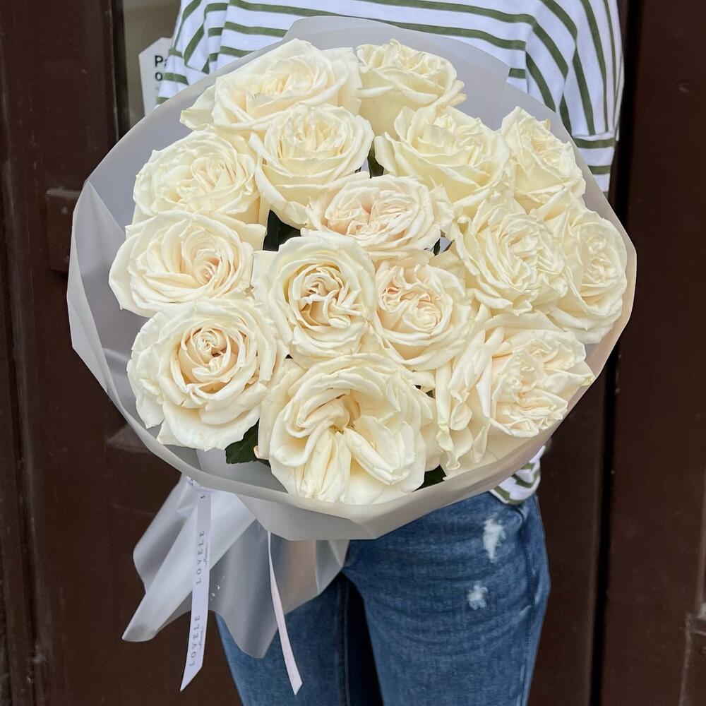 белая пионовидная роза – 15 шт.Упаковка матовая пленка – 3 шт.Лента атласная – 1 шт.Кризал (подкормка) – 1 шт.