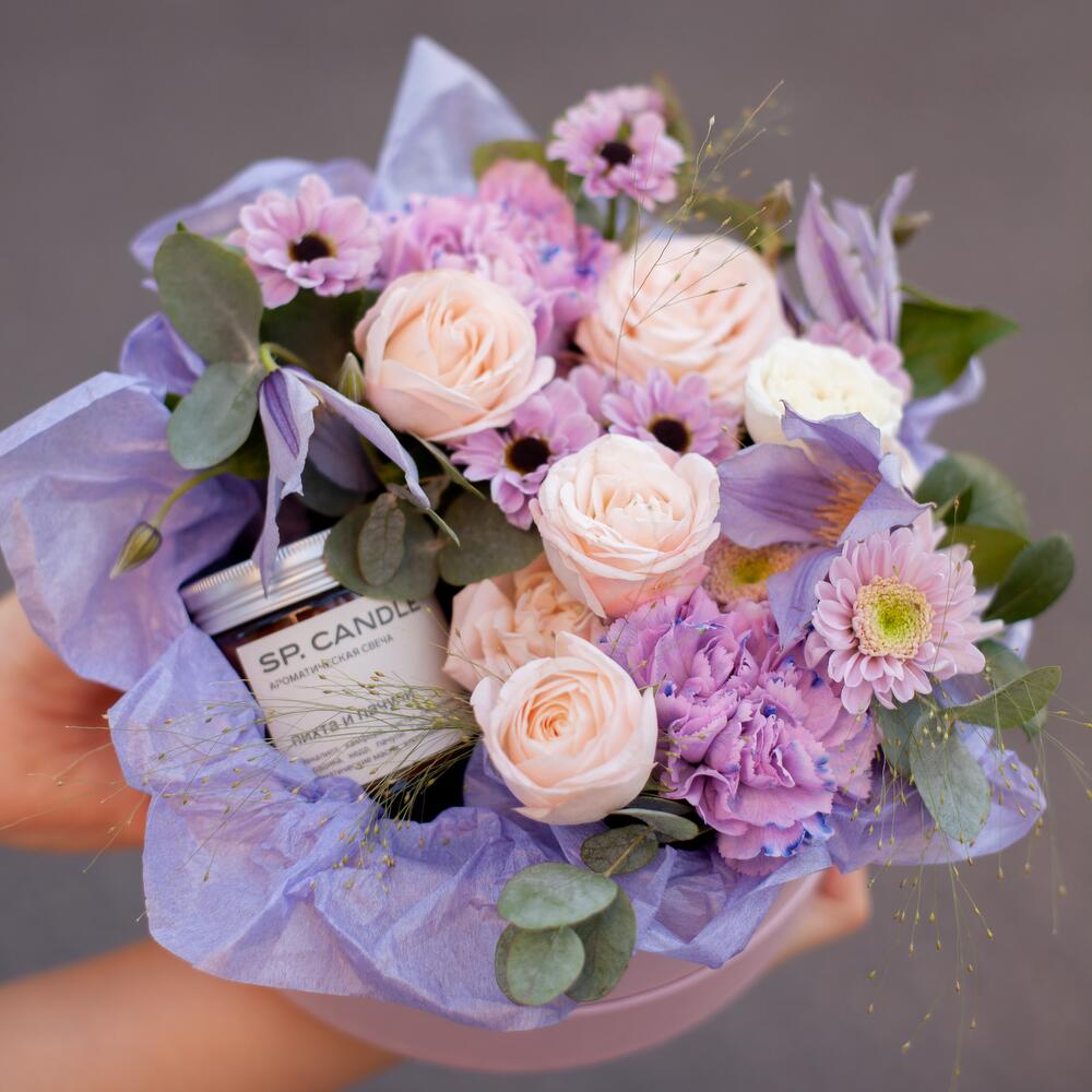 Аромасвеча – 1 шт.Шляпная коробка – 1 шт.Тишью – 1 шт.Кустовая пионовидная роза – 2 шт.Диантус – 2 шт.Кустовая хризантема – 2 шт.Клематис – 1 шт.Эвкалипт – 2 шт.