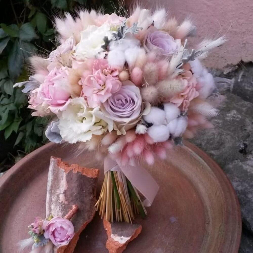 Лента – 2 шт.Лизиантус – 1 шт.Маттиола – 3 шт.Роза кустовая – 3 шт.Роза – 3 шт.Цинерария – 2 шт.Хлопок натуральный – 5 шт.Лагурус (сухоцвет) – 70 шт.