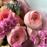Кустовая роза – 4 шт.Ранункулюс – 3 шт.Пионовидная роза – 3 шт.Оксипеталум – 3 шт.Статица – 2 шт.Эвкалипт – 2 шт.декоративная упаковка – 1 шт.Атласная лента – 1 шт.