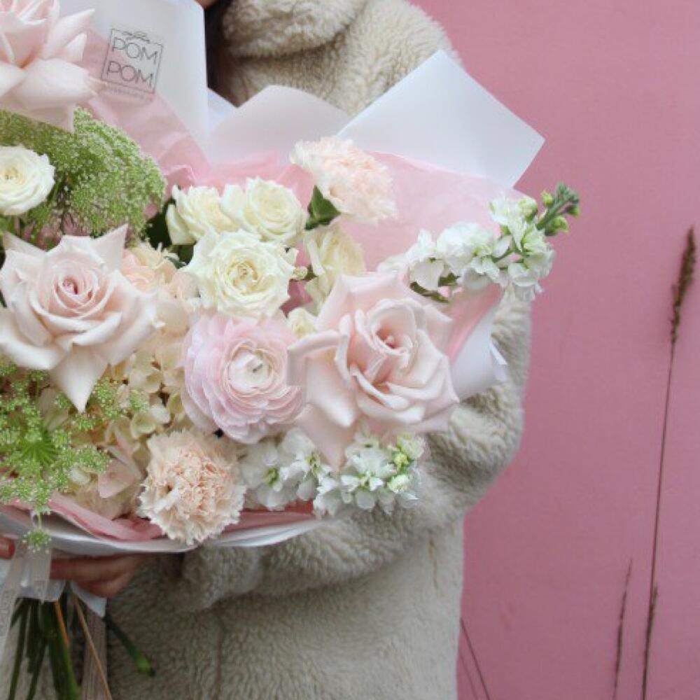 Роза – 5 шт.Амми – 2 шт.Маттиола – 2 шт.Гортензия – 1 шт.Гвоздика – 3 шт.Лагурус – 3 шт.Упаковка дизайнерская – 1 шт.