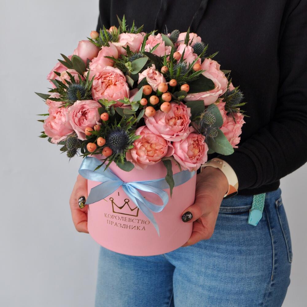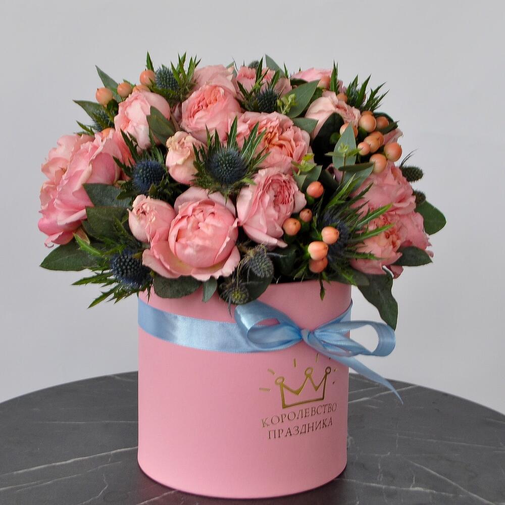 Гиперикум – 5 шт.Лента – 1 шт.Эвкалипт – 1 шт.Эрингиум – 5 шт.Коробка шляпная – 1 шт.Роза кустовая джульетта – 9 шт.
