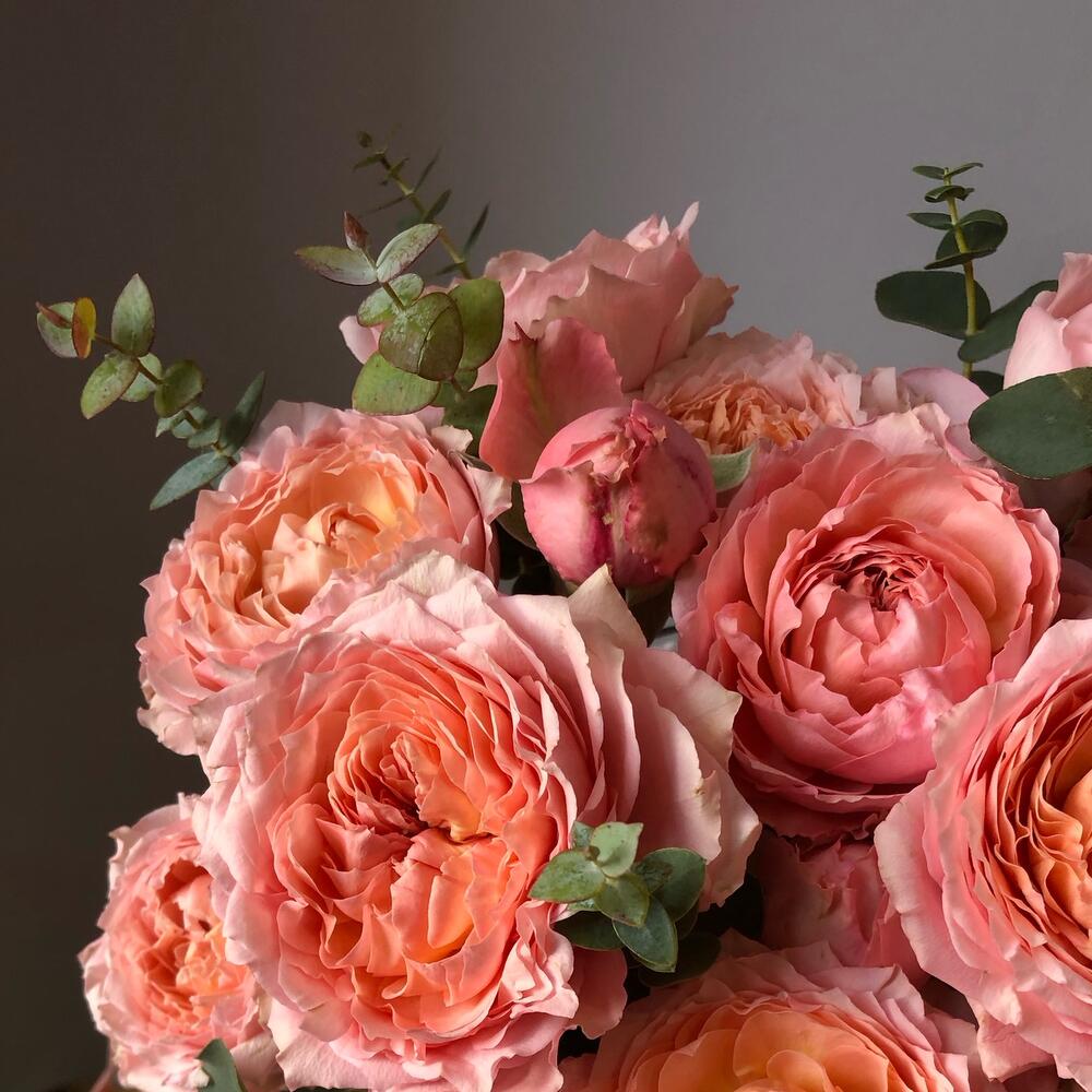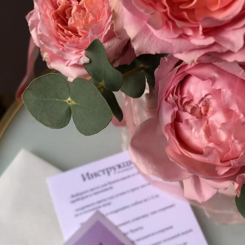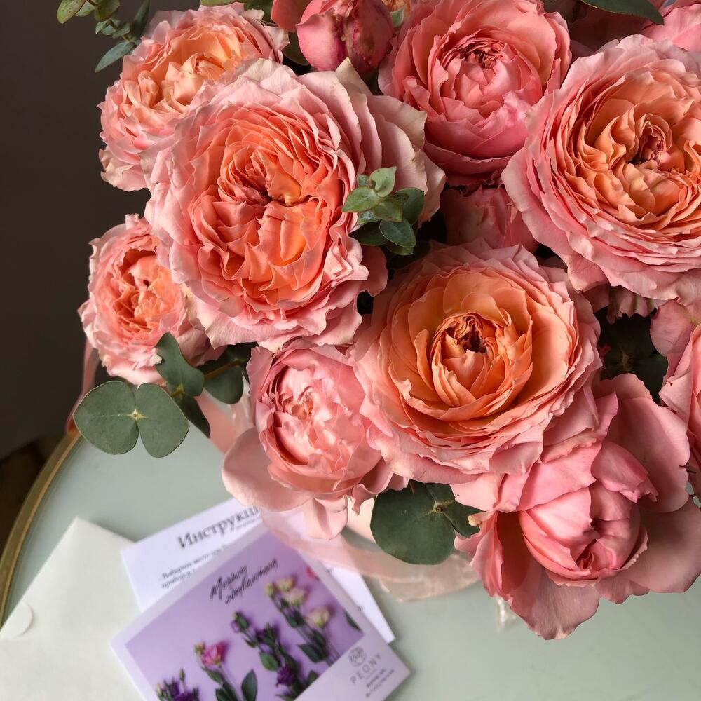 Пионовидные розы розово-персиковых оттенков с ароматным эвкалиптом Флористы студии Peony собрали данную композицию с огромным трепетом из самых свежих цветов Цветы в коробке – это удобно, так как для них не нужна ваза. Цветы находятся в специальной флористической губке, которую необходимо поливать раз в два дня В подарок к композиции прилагается открытка с вашими пожеланиями и инструкция по уходу за цветами.