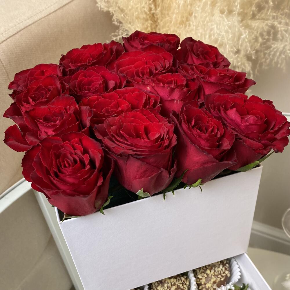 Подарочный набор с красными розами – 15 штКлубники в молочном шоколаде – 9 штукСрок хранения клубники 24 часа при температуре от +2 до +8 градусов