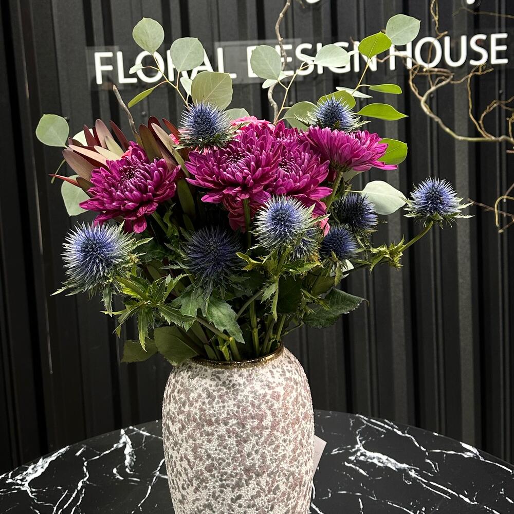 левкадендрон – 3 шт. Эвкалипт – 3 шт. Эрингиум – 3 шт. Хризантема одноголовая – 9 шт. Роза пинк флойл – 9 шт. спрей роза пионовидная – 3 шт.
