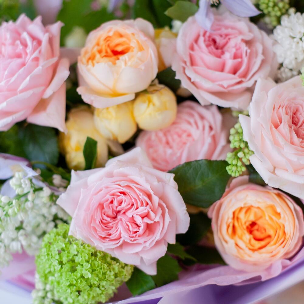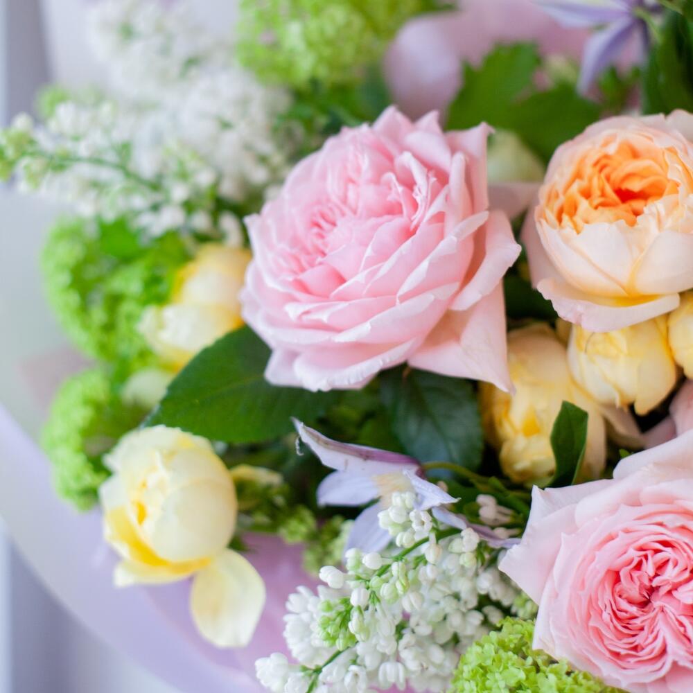 Пышный ароматный букет с весенней сиренью, пионовидными розами Хитоми и Айко, сливочной кустовой розой Лимончелло и салатовым Вибурнумом
