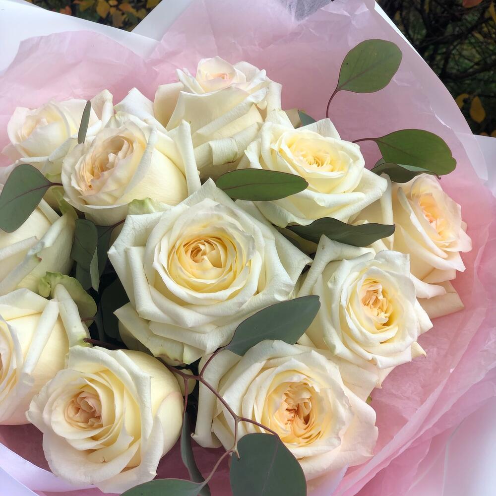 Шикарные розы «свет свечи» с крупным бутоном и красивым раскрытием. С добавлением зелени эвкалипта.