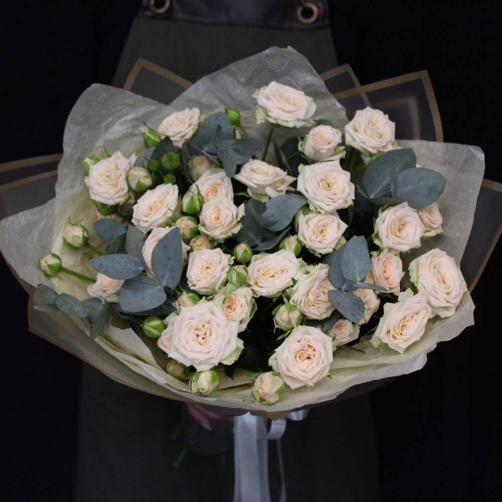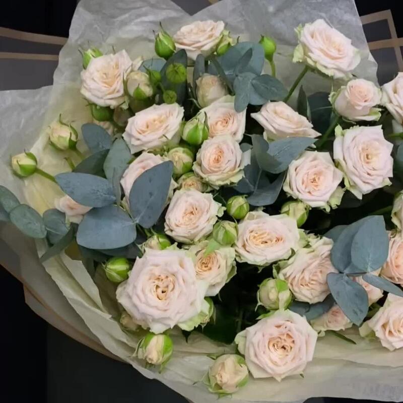 Эвкалипт – 3 шт.Лента атласная – 2 шт.Тишью – 3 шт.Пленка матовая – 3 шт.роза кустовая таня – 7 шт.