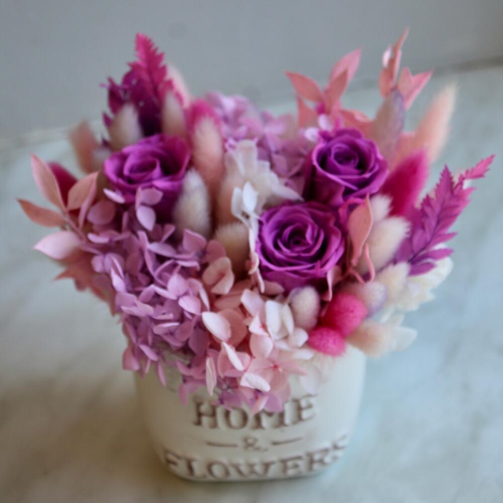 Роза одноголовая – 3 шт.Гортензия – 1 шт.пушистики – 1 шт.Керамическое кашпо – 1 шт.