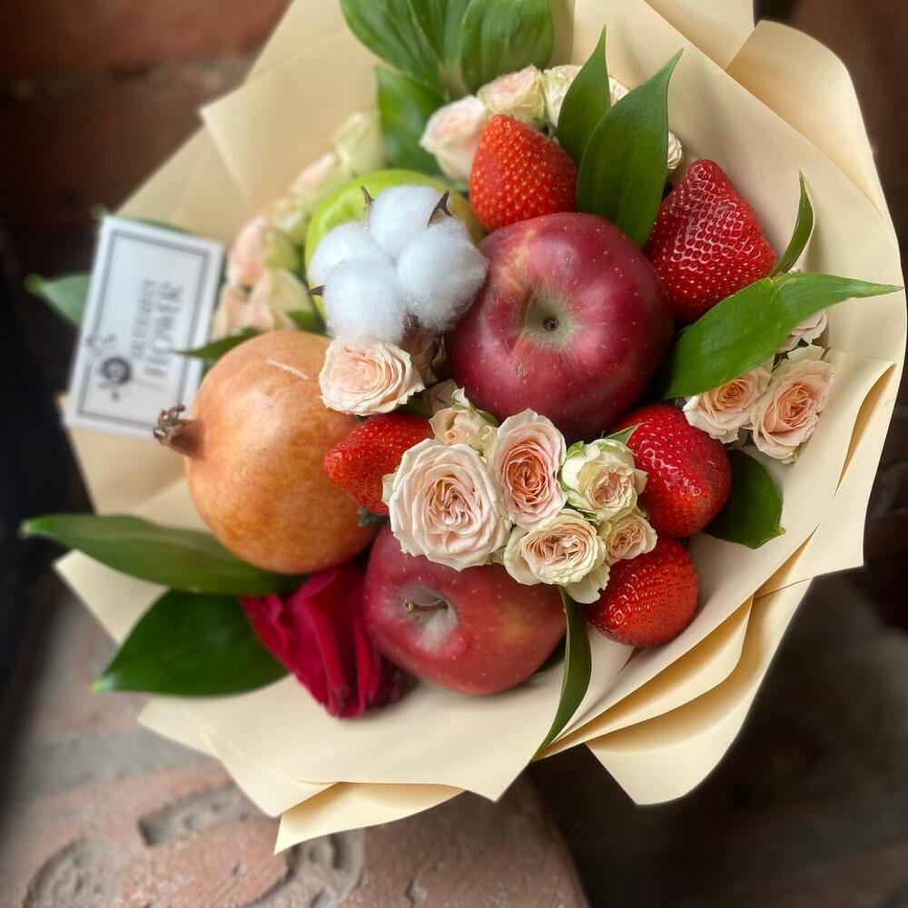 Съедобный букет с розами, клубникой и фруктами “Наливное яблочко”